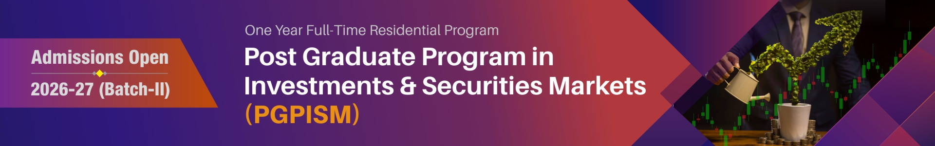 The one-year PGPISM is an ideal platform for those with a passion for financial/securities markets, aspiring for in- depth knowledge and a long-term career in these and related areas. Graduates from various disciplines, such as Commerce & Accounting, Management, Economics, Law, Mathematics, Statistics, Engineering, etc. will develop their analytical capabilities, together with practical insights, in this PGPISM Program, for taking leadership roles in the financial/securities markets domain.
