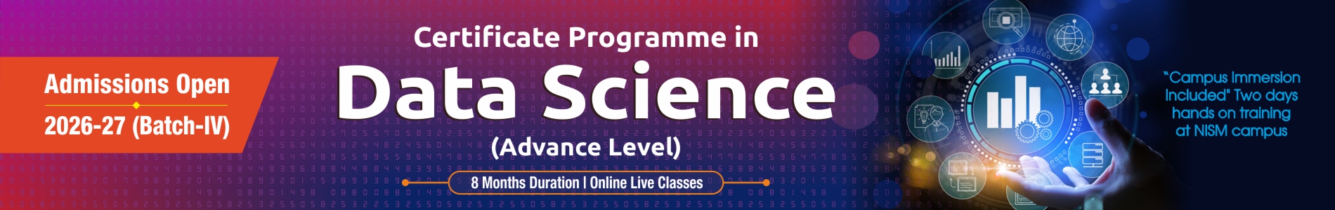 Certificate Program in Data Science (Advance) Advance Data Science is for professionals who want to understand the in-depth knowledge of Data Science in Securities Markets. Advance Course is more application based in the field of Financial Markets. The Advance levels comprise courses in Machine Learning, Deep Learning, Financial Econometrics and Introduction of Big Data etc.